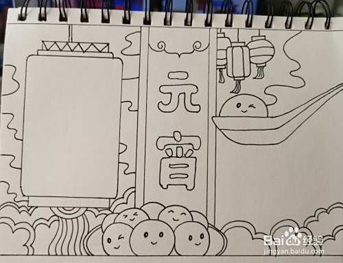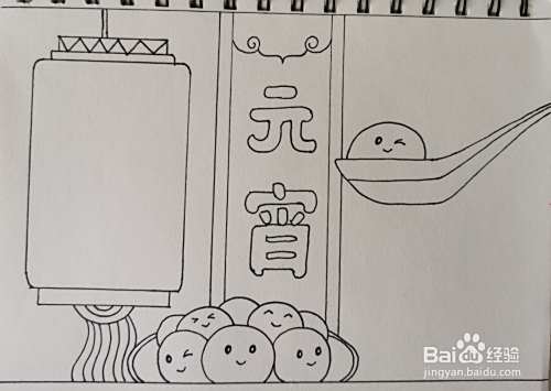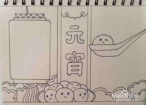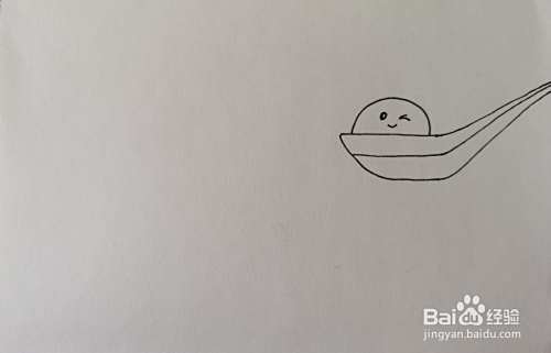 首先在画面的右侧画出一个汤勺,里面放着萌萌的汤圆。
