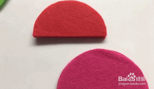 然后取出西瓜红色和玫瑰红的毡布,切成半圆形。