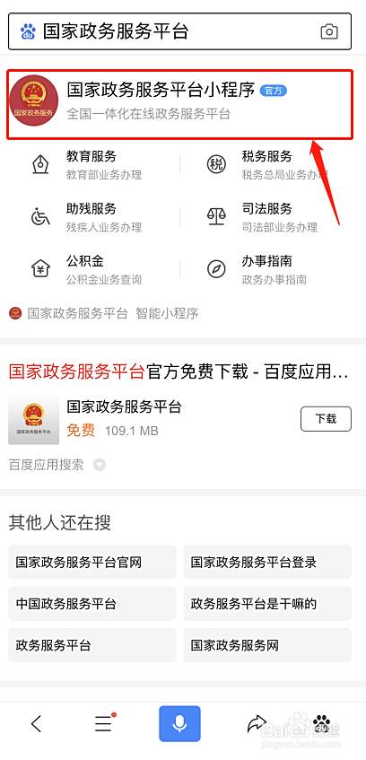 打开后搜索【国家政务服务平台】,在跳转的页面中选择【国家政务服务平台】小程序。