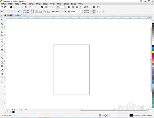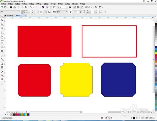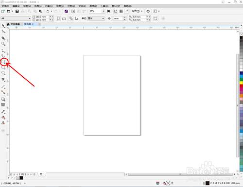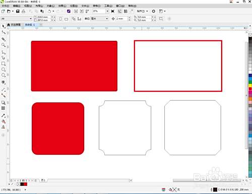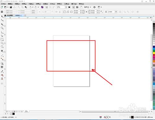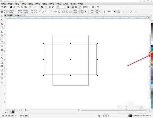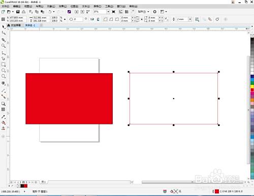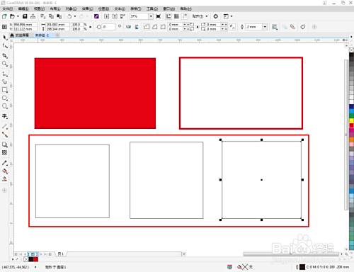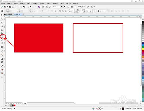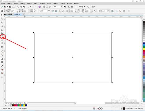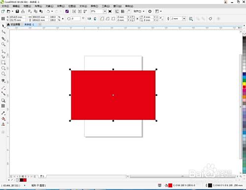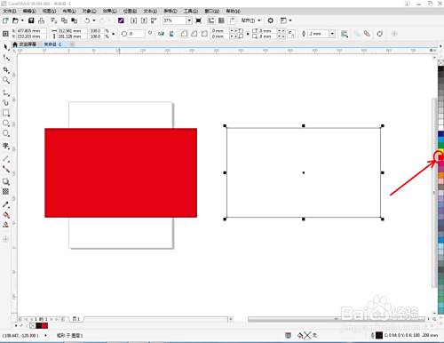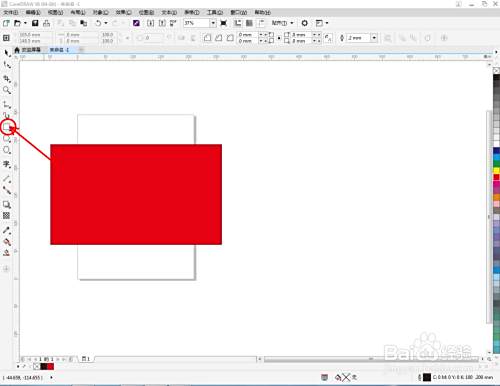 打开CorelDRAW X8软件,点击【矩形工具】,在作图区域绘制一个矩形图案。鼠标左键点击右边色板中的红色,可以绘制出一个红色矩形图案;