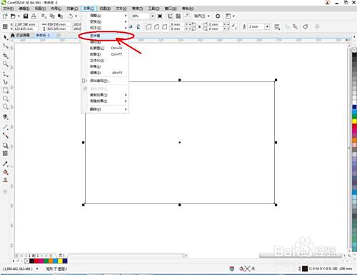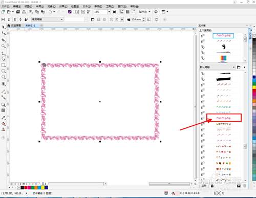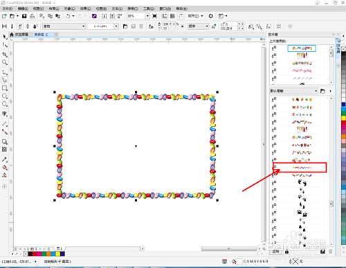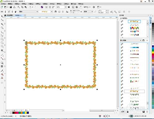 点击【矩形工具】,在作图区域绘制一个矩形图案。点击【效果】-【艺术笔】,弹出艺术笔选择栏,选中一款效果笔刷进行添加,可制作出独特的矩形方框图案。
