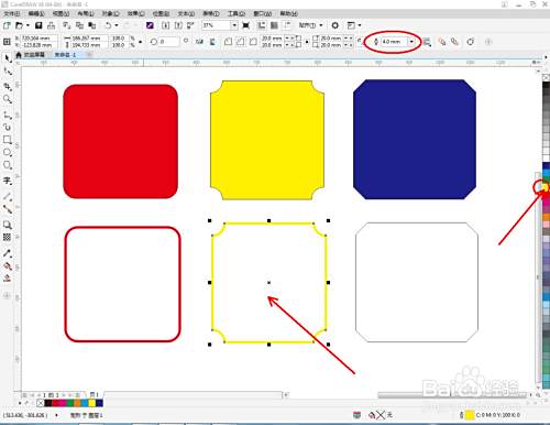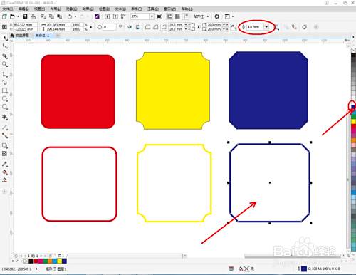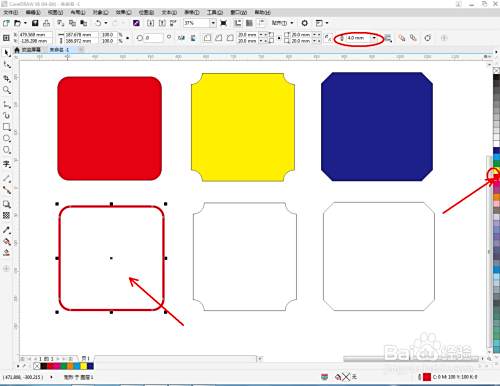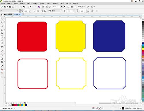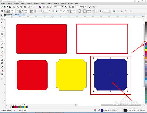 选中圆角矩形图案,鼠标左键点击右边色板中的红色,绘制出红色圆角矩形图案。同样的步骤,完成另外两个图案的制作(如图所示);