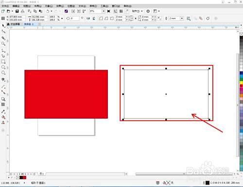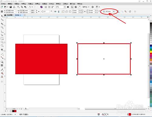 点击【矩形工具】,在作图区域绘制另外一个矩形图案。鼠标右键点击右边色板中的红色,可以绘制出一个红色矩形框图案。点击上方【轮廓宽度】可设置方框的宽度(如图所示);