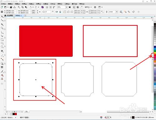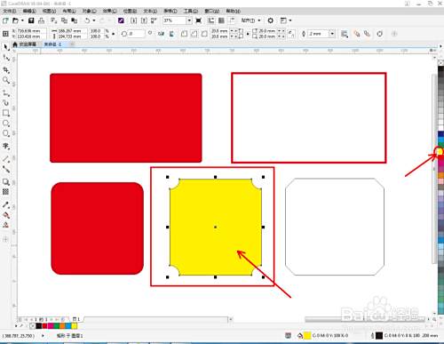 选中圆角矩形图案,鼠标右键点击右边色板中的红色,绘制出红色圆角矩形方框图案。同样的步骤,完成另外两个方框图案的制作(如图所示);
