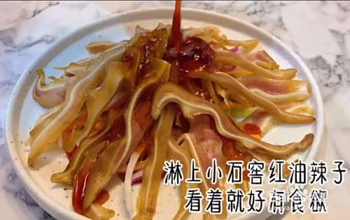 在准备好的猪耳和蔬菜上淋上大厨四宝红油辣子