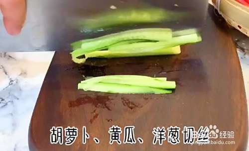 将胡萝卜,黄瓜,洋葱切丝,切成长条状。