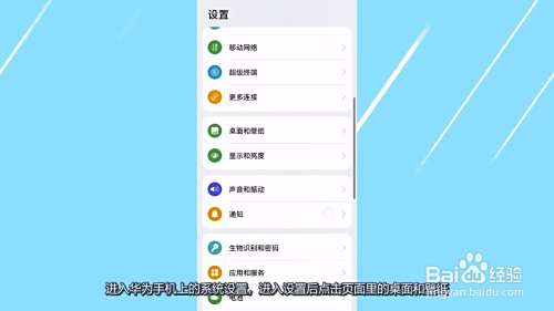 进入华为手机上的系统设置,进入设置后点击页面里的桌面和壁纸。