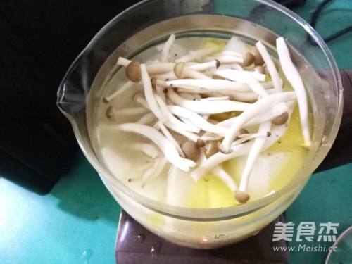 8最后10分钟,将蟹味菇放入壶中,继续煮,