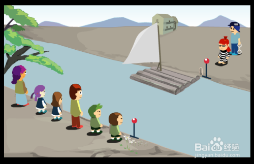 首先,点击警察叔叔上竹筏,然后点击犯罪分子上竹筏。之后点击右下角那个上边有小红球下边小黑棍的开竹筏机关。竹筏就开动了,到对岸后,俩人自动下竹筏,然后点击警察叔叔上竹筏,让犯罪分子自己那呆着。点击右上角那个上边有小红球下边有小黑棍的开竹筏机关,把警察叔叔运回来。
