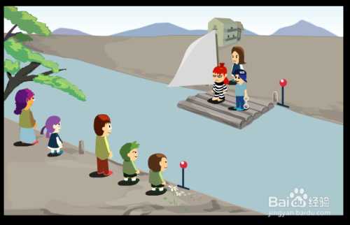 点击妈妈上竹筏,点击爸爸上竹筏,留下大儿子和二儿子,点击右下角的机关,启用竹筏过河,让爸爸妈妈一起到对岸。这时,对岸的人有妈妈、大女儿、二女儿、警察叔叔、犯罪分子和爸爸。点击爸爸上竹筏,再点击右上角机关,让爸爸乘坐竹筏回来。