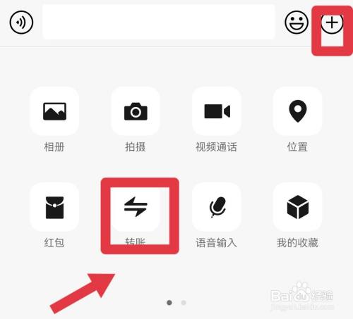 在聊天页面点击对话框后面的符号,在弹出菜单中点击转账。