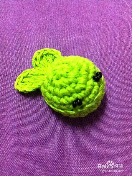 在圆球的前身上半部分两边个缝上一个小黑色珠子,做成鱼眼睛。这样一个漂亮可爱的小鱼挂件就完成了。
