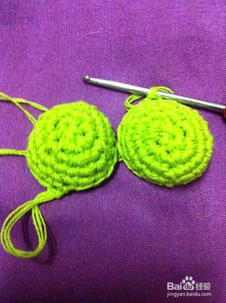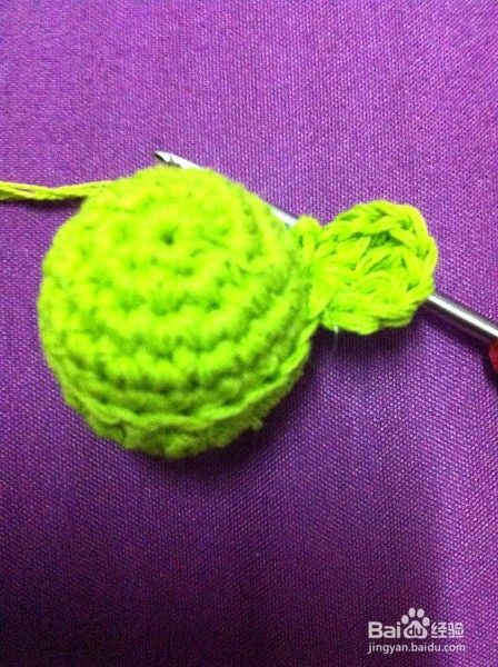 按照第一步骤和第二步骤大方法。首先用钩针先钩出一个活头结线圈,然后在活头结线圈里面先钩出7针锁针,然后紧锁到第一针锁针形成的针孔里面,拉紧活头结,这样就钩出一个小圆心。然后每针针孔锁针2针,完成一圈,共计14针。接下来开始,第一针针孔锁针2针,第二针针孔锁针1针,第三针针孔锁针2针,第四针针孔锁1针,循环完成一圈,共计完成21针。然后再正常每针针孔锁针1针,完成1圈,共计完成21针。钩出两个小半圆球。