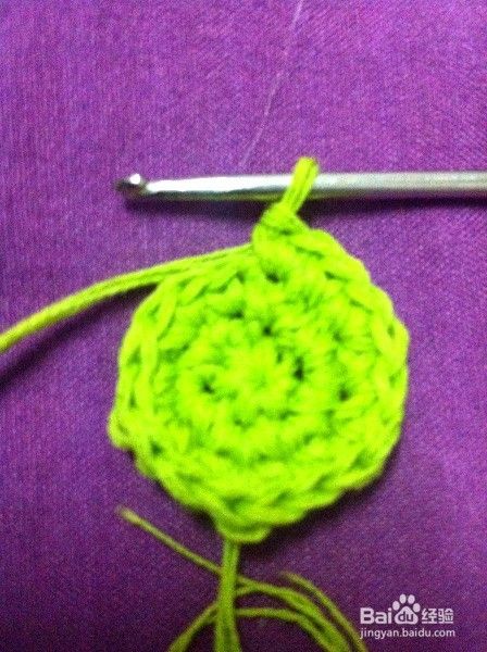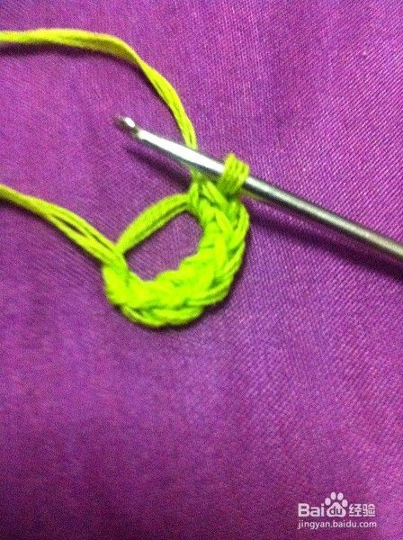 绿色线开始编织,首先用钩针先钩出一个活头结线圈,然后在活头结线圈里面先钩出7针锁针,然后紧锁到第一针锁针形成的针孔里面,拉紧活头结,这样就钩出一个小圆心。然后每针针孔锁针2针,完成一圈,共计14针。