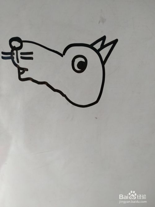 在狼头部的中间位置,画出一个圆圈。在圆圈的右侧画一个小点。在狼头部的上方画出狼尖尖的耳朵。