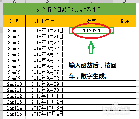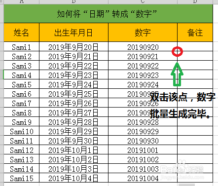 双击“数字”单元格下方第一单元格右下角,“出生年月日”转换“数字”的数值批量生成。