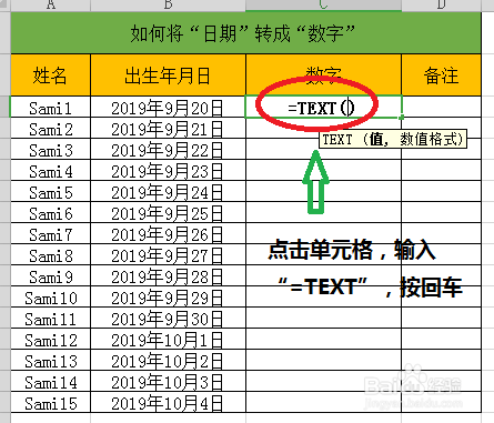 点击“数字”下方第一个单元格,输入“=Text()”。