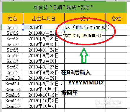 在“B3”字样后输入,“YYYYMMDD”字样,点击回车。