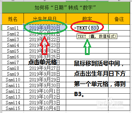 点击“Text()”函数的()中间【注:此时鼠标光标在()中间】,再次点击“出生年月日下方第一个单元格”,此时括号中呈现出“B3”字样。
