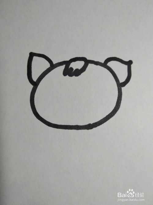 在椭圆不闭合的位置,画一缕倾斜的毛,在椭圆形的左右两端,画出猪的耳朵。
