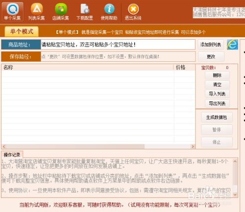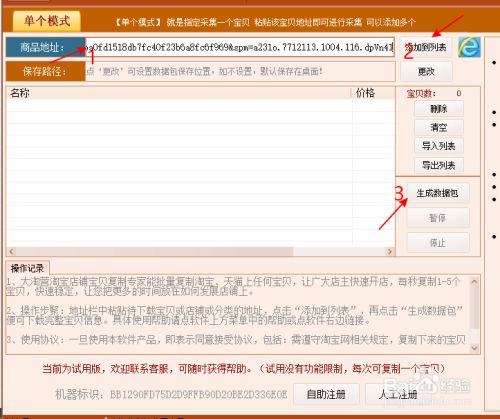 然后再来到大淘营宝贝复制专家这里,把我们刚才复制的链接粘贴到商品地址哪里,然后添加到列表里,最后就点击生成数据包,看下图