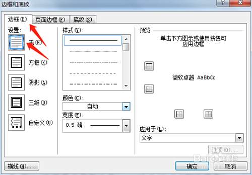 除了这种方法之外,我们也可以在开始选项卡中选择边框和底纹选项,点击边框和底纹之后,弹出一个对话框,在对话框中找到边框选项。