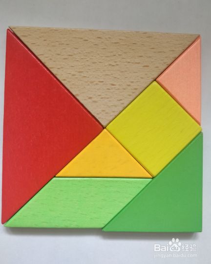 正方形下面偏左的位置放上绿色三角形,斜边与正方形边一齐。