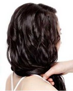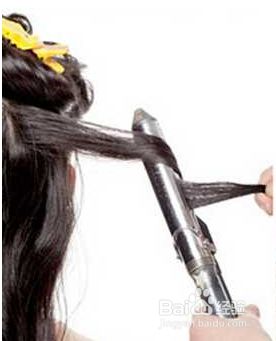 从后方处取出一束头发,用卷发棒烫卷,剩下的头发也按照同样的方法打理,烫出一头大波浪卷发。