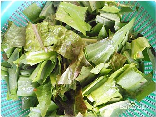 2.油麦菜五六棵,洗干净。用刀切成一段段的,放竹篮控干水备用。