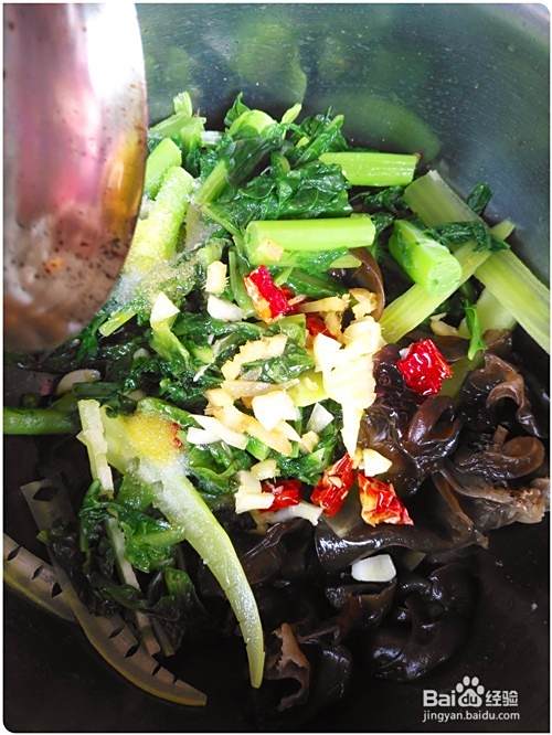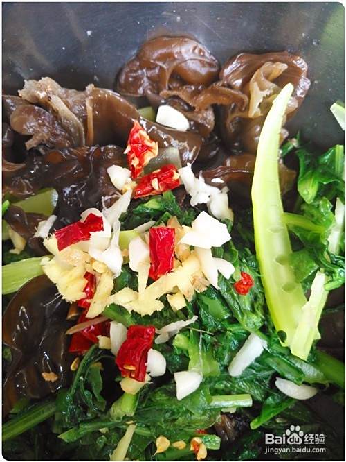 6.油麦菜捞出控干净水,将木耳和油麦菜倒在一起。撒上蒜末,生姜粒和辣椒段。