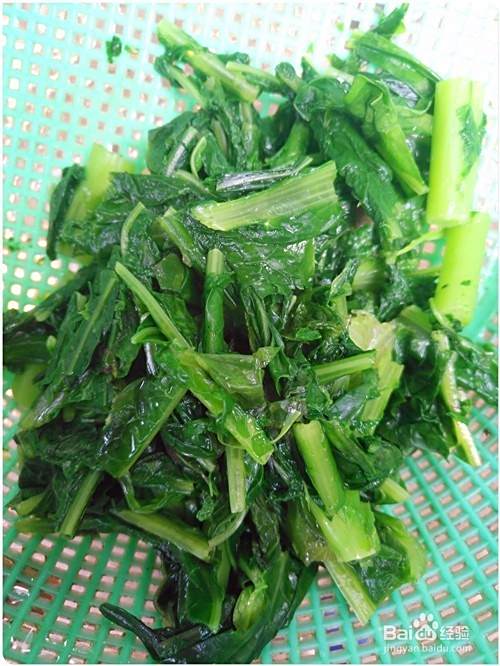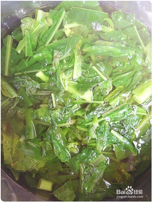 5.干净的盆子里盛一点冷水,捞出煮好的油麦菜进去。过一遍冷水可以让菜吃起来更脆也能保证油麦菜的口感。