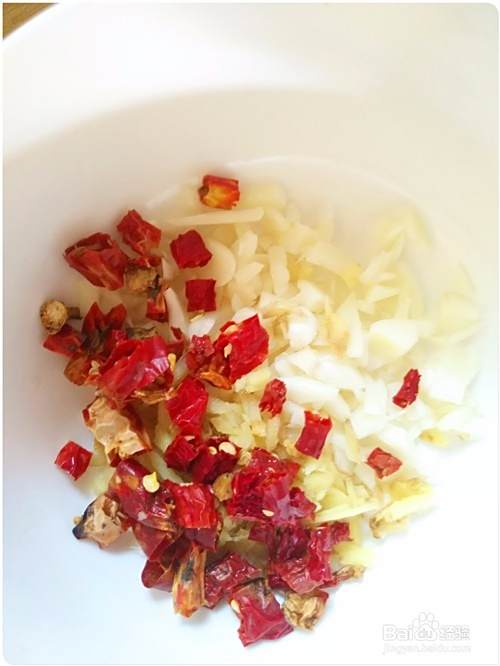3.大蒜头四五瓣,用刀拍扁以后再切成蒜丁,红辣椒切成一小段,生姜两片切成生姜粒。