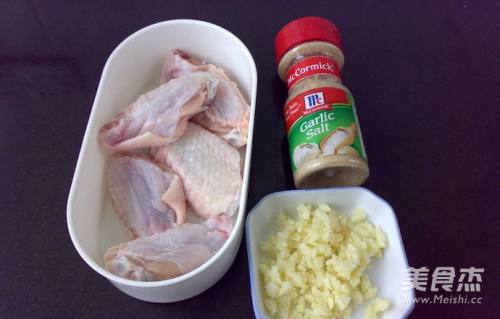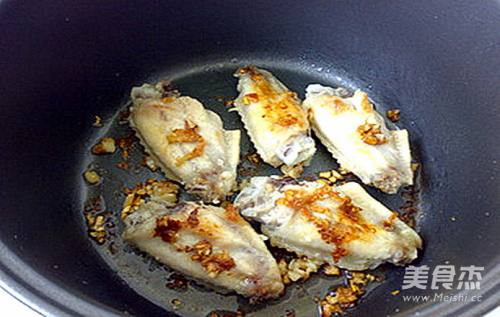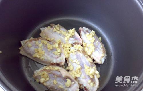5把鸡翅与蒜茸一起放进电饭煲内,按下煮饭键