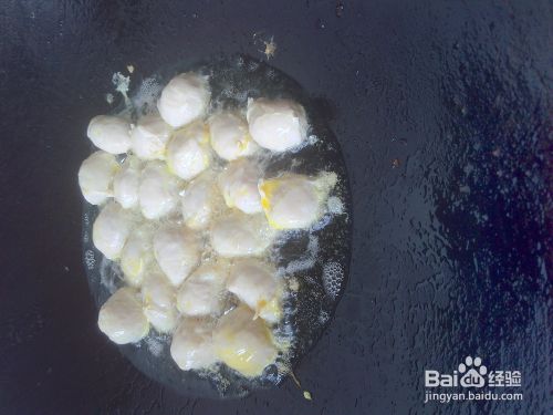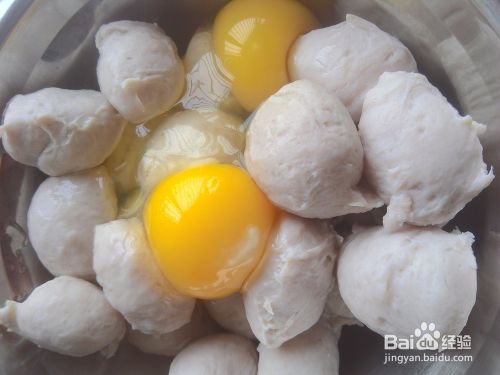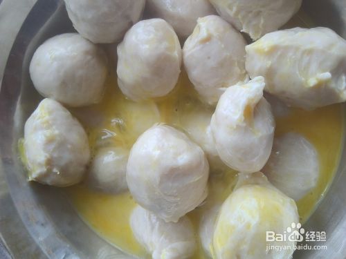 鸡蛋打散和肉丸拌匀。