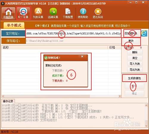 等待工具自动采集宝贝信息,采集成功后弹出一个复制已完成的提示,如上图⑥,这样数据包就生成好了。