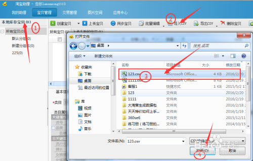 把生成的数据包csv文件导入淘宝助理。如图步骤,①点淘宝助理宝贝管理左边的本地库存,②点导入,③选择刚才生成的数据包的csv文件,④打开