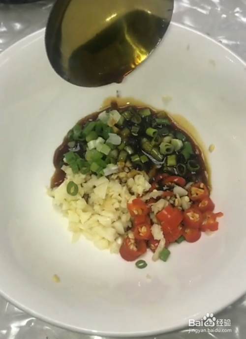 3、调汁放蒜、小米辣椒、葱、酱油。