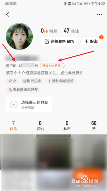 进入个人主页后,可以看到头像下方有用户ID,这个就是我们的快手ID了,我们点击升级为快手号
