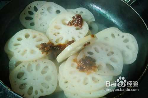 翻炒大概3分钟之后藕8分熟了,加入一小勺郫县豆瓣酱,少许盐一起翻炒