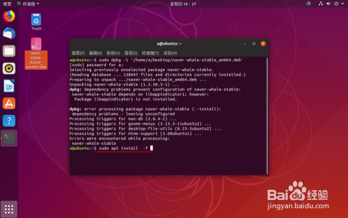 输入安装的命令:【sudo dpkg -i】,把deb拖入到命令之后。