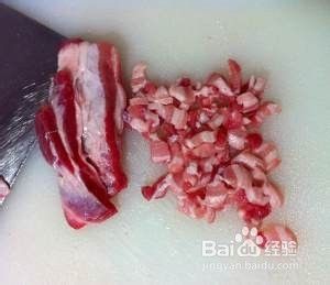 带皮五花肉浸泡后冲洗干净,切成指甲盖大小的块;