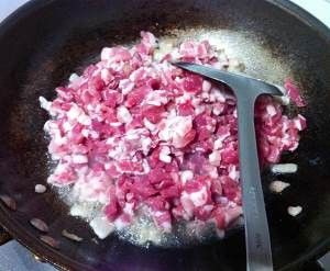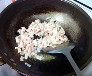 热锅凉油,烧到六成热先倒入肥肉煸出油;