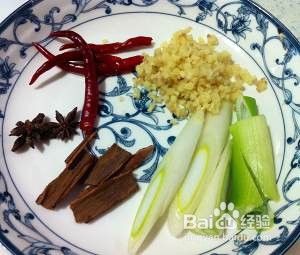 再放入葱段、桂皮、八角、辣椒等。