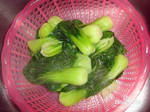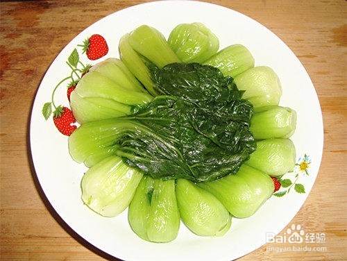 把焯熟沥干水的油菜整齐铺放于盘内。