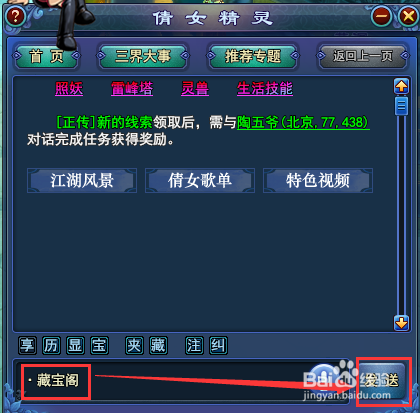 然后就是在弹出的窗口中输入【藏宝阁】,再点击【发送】按钮,如下图所示。