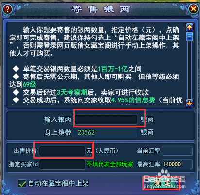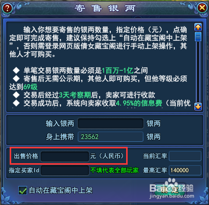 接着就是输入你要交易的东西(银两就输入多少,物品和灵兽就选择你要交易东西),再输入你要交易的价格,然后点击【确认】按钮完成交易设置,如下图所示。