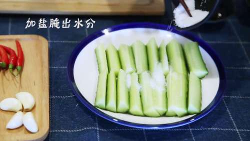 1黄瓜切成段,再切成条,加盐腌出水分。