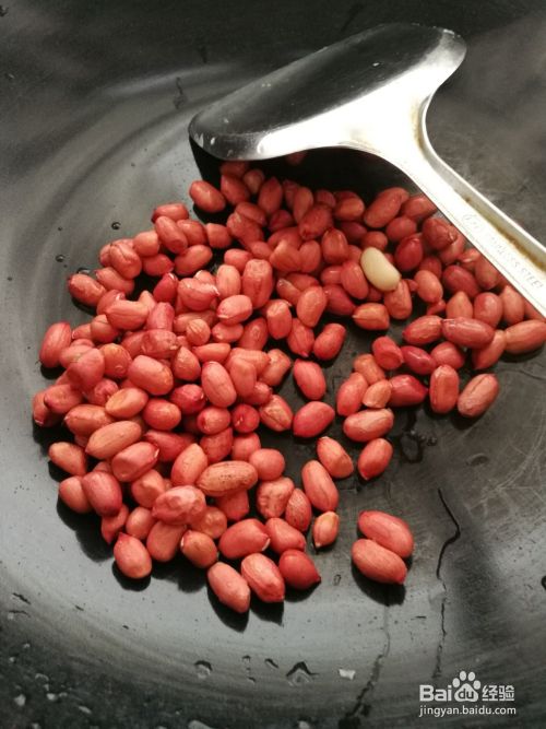 把花生米捞出来沥干。开火预热锅底,将花生米先放进去,把水炒干