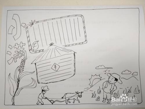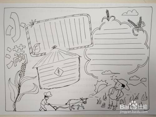 首先收集小满节气的相关素材和元素,然后规划布局,把各元素按照提纲摆放在手抄报边框内。