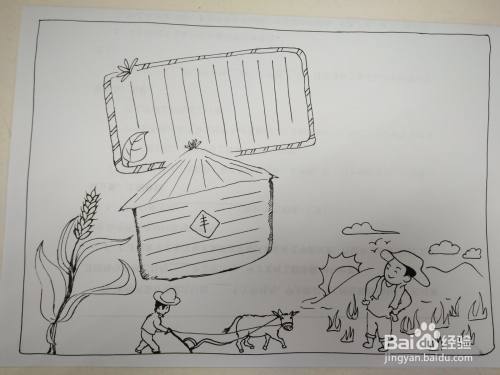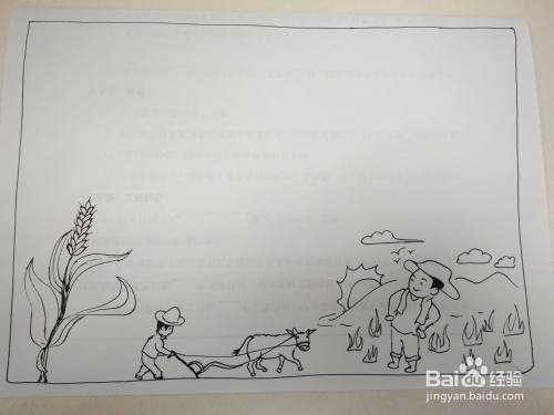 小麦右侧绘制一个犁地的农民伯伯,手抄报右下角绘制插秧的农民兄弟以及身后的山丘和太阳。